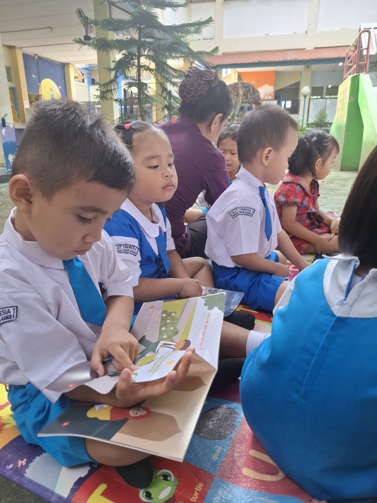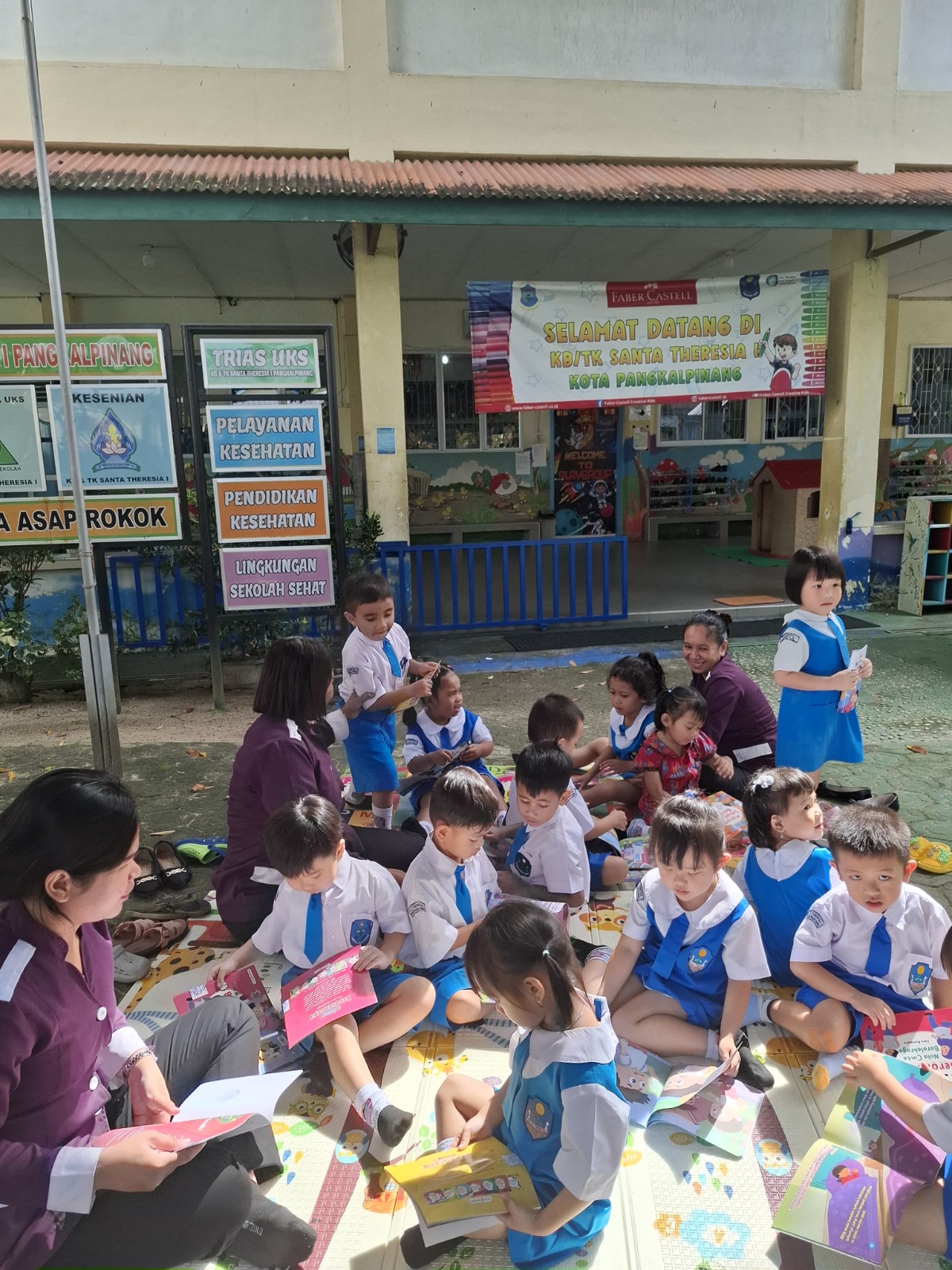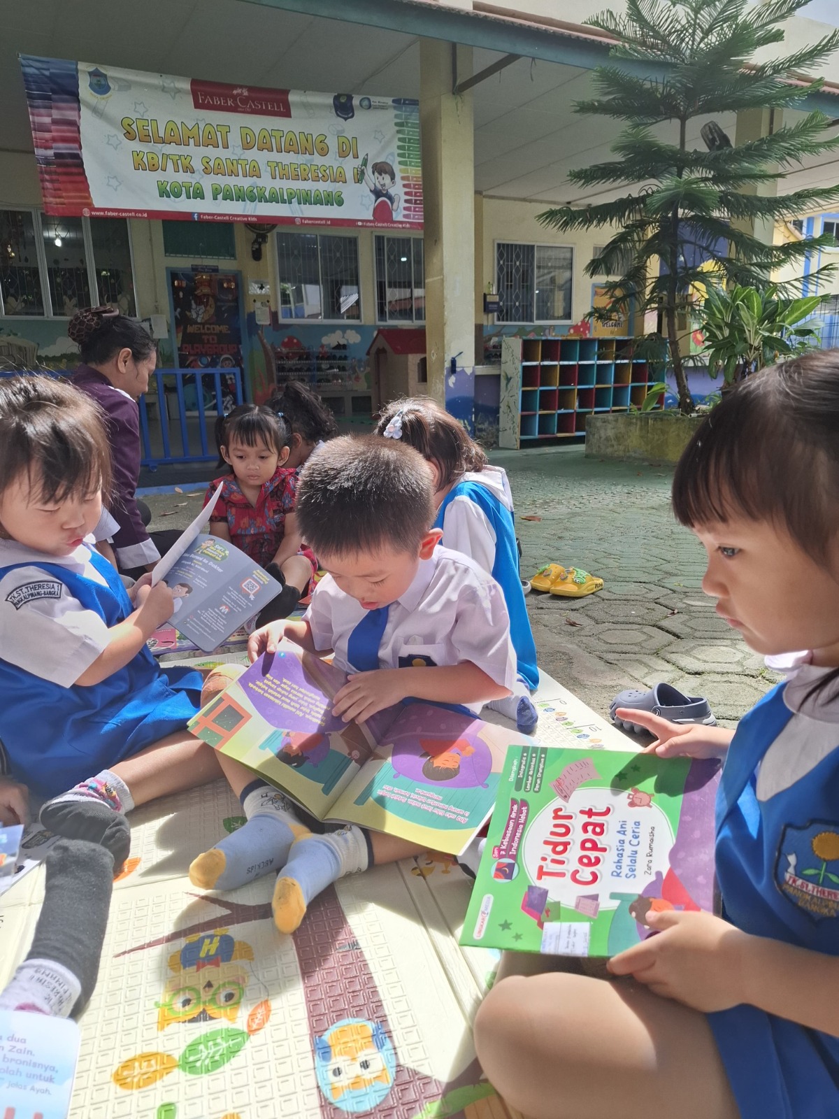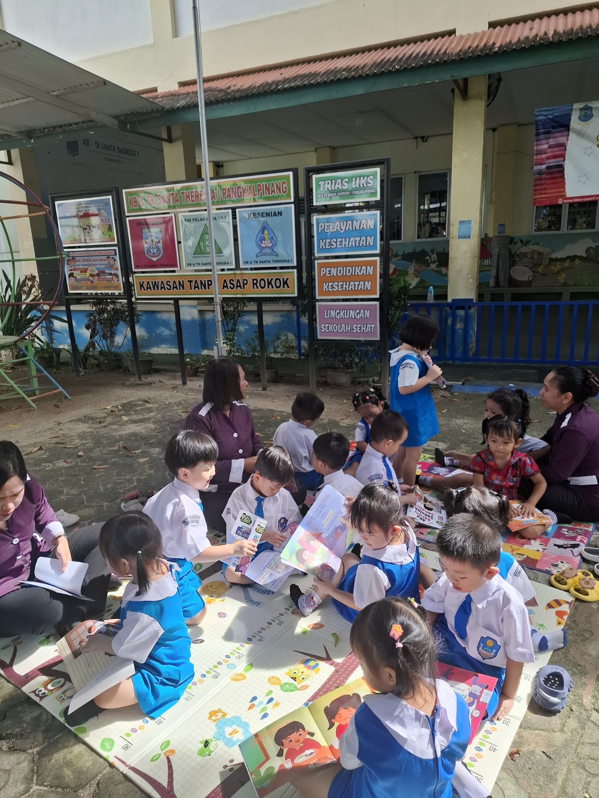 Anak-anak Kelompok Bermain (KB) Santa Theresia 1 mengikuti kegiatan pengembangan literasi yang dilakukan di luar kelas. Kegiatan ini bertujuan untuk menumbuhkan minat anak terhadap membaca, mengenal huruf, serta melatih kemampuan berkomunikasi sejak usia dini.